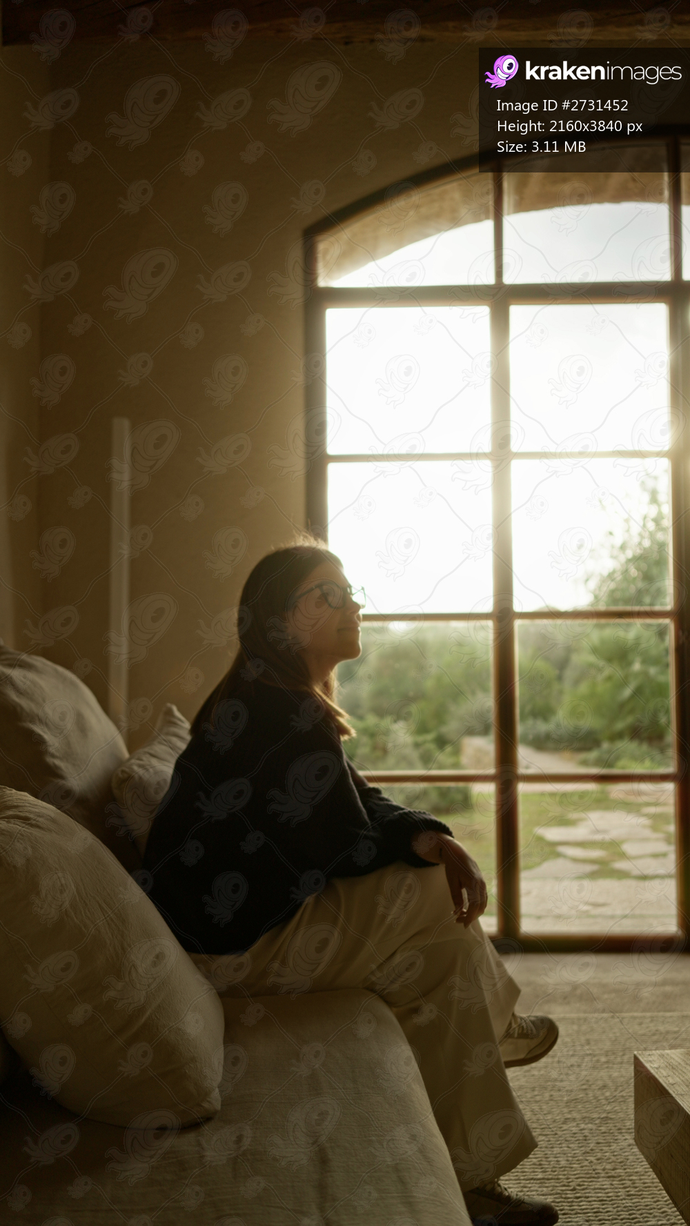 Young woman relaxing indoors in a mediterranean house with large windows overlooking a garden, seated on a comfortable sofa, enjoying the tranquil and serene ambiance of her home. - Kraken Images