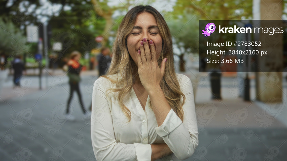 Young woman resting hand on cheek in white blouse at urban street corner; boredom drowsiness fatigue sleepiness.