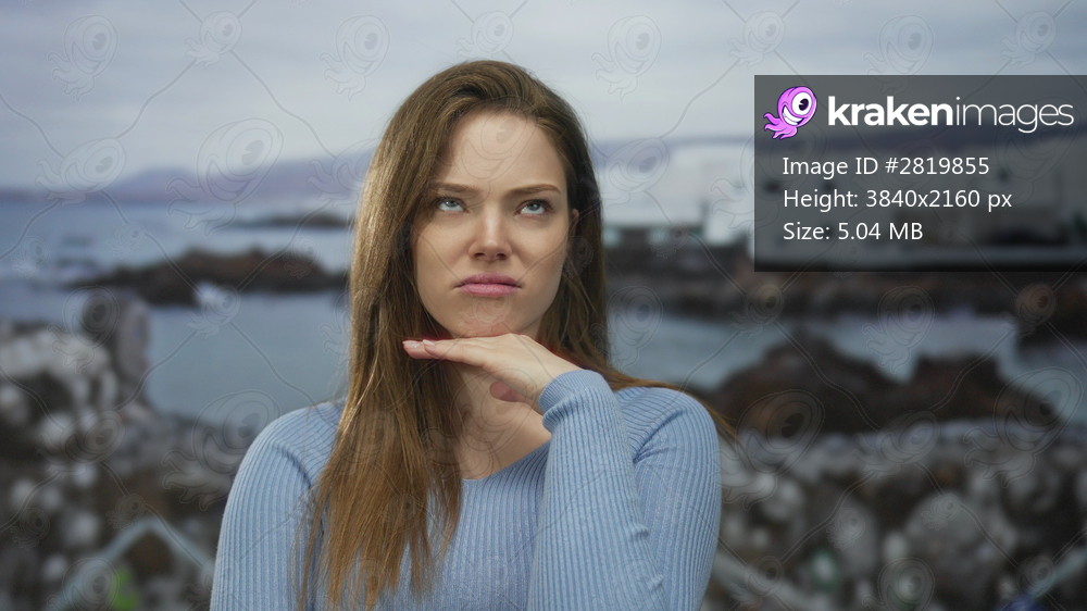 Young woman resting hand under chin in front of white seaside building overlooking rocky shore and choppy water; doubt uncertainty skepticism hesitation. - Kraken Images