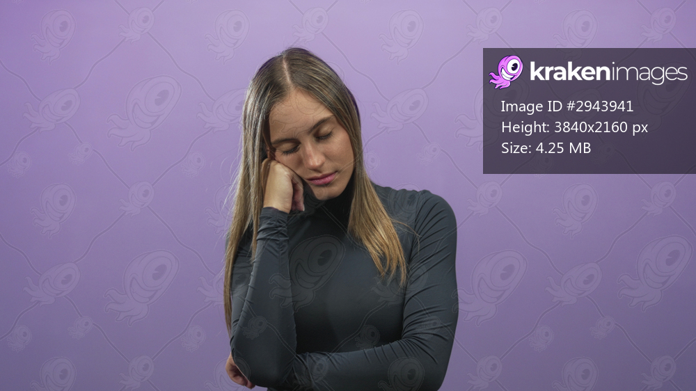 Young woman resting head on hand with eyes closed and arm crossed in studio against purple backdrop wearing black turtleneck; calm.