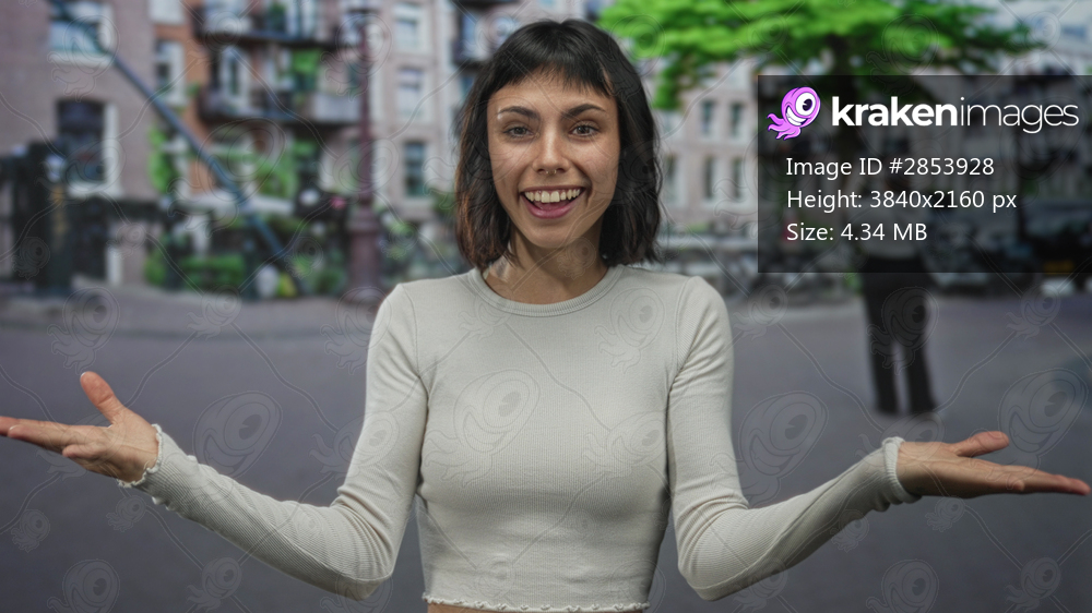 Young woman rubs eyes with fists on crowded urban street near brick buildings and parked cars; weariness.