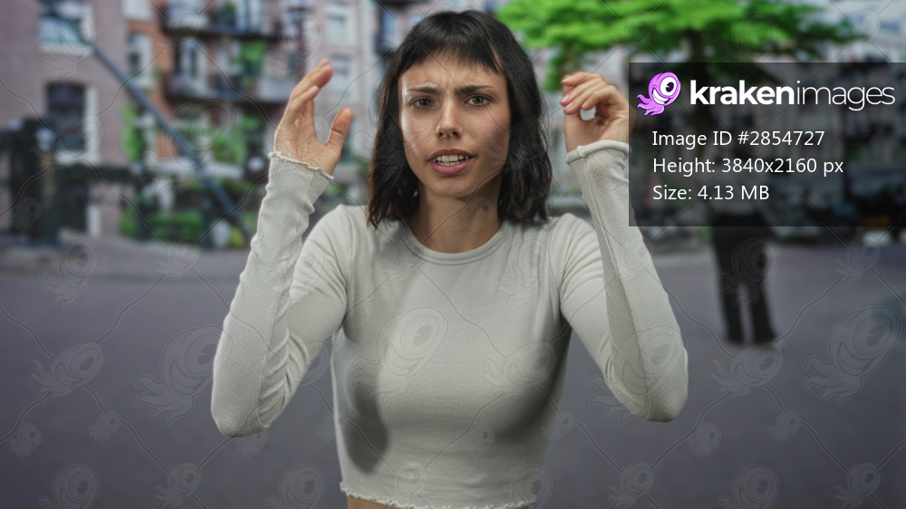 Young woman rubs eyes with fists on crowded urban street near brick buildings and parked cars; weariness.