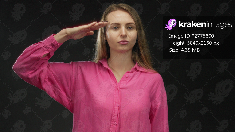 Young woman saluting over an isolated black background wearing a pink shirt, conveying confidence and respect.