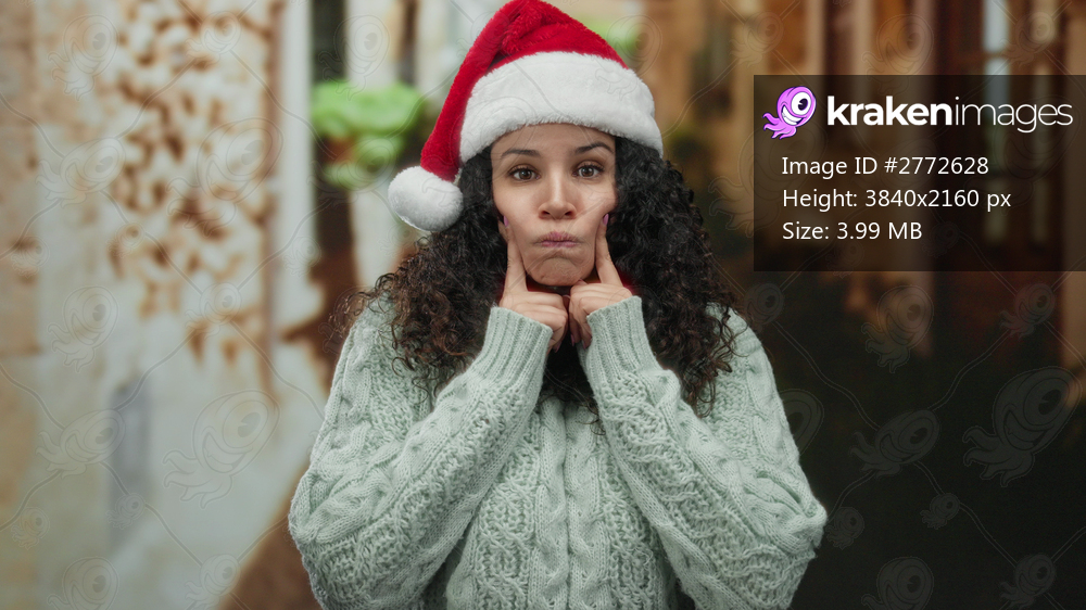 Young woman with santa hat and curly hair making a puffy face outside on a festive street in a cozy sweater, showcasing holiday spirit and seasonal fashion. - Kraken Images
