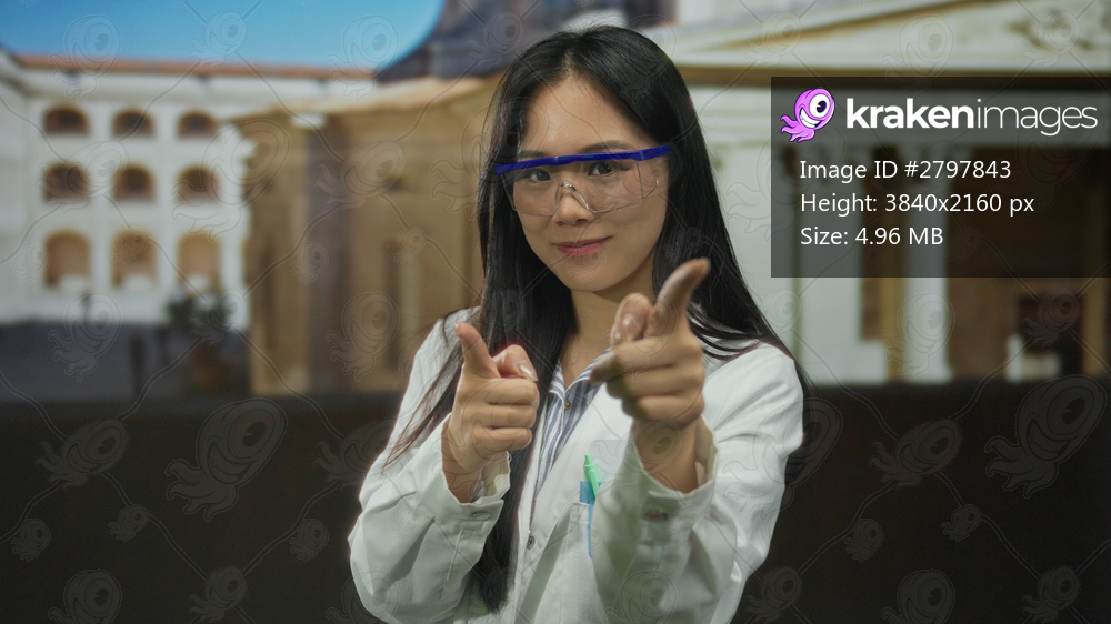 Young woman scientist in lab coat smiling outdoors with goggles pointing playfully at camera against historic architecture