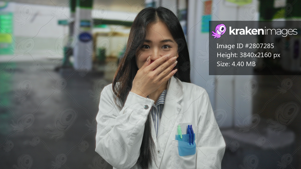 Young woman scientist in uniform covers mouth with hand at petrol station outdoors conveying surprise or excitement
