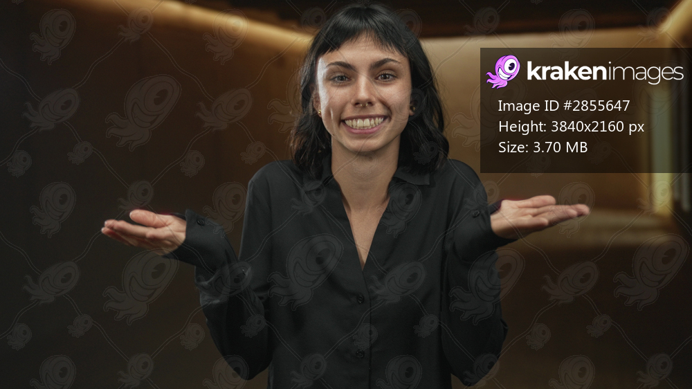 Young woman with septum piercing and black shirt lifts open palms in studio hallway; uncertainty doubt.