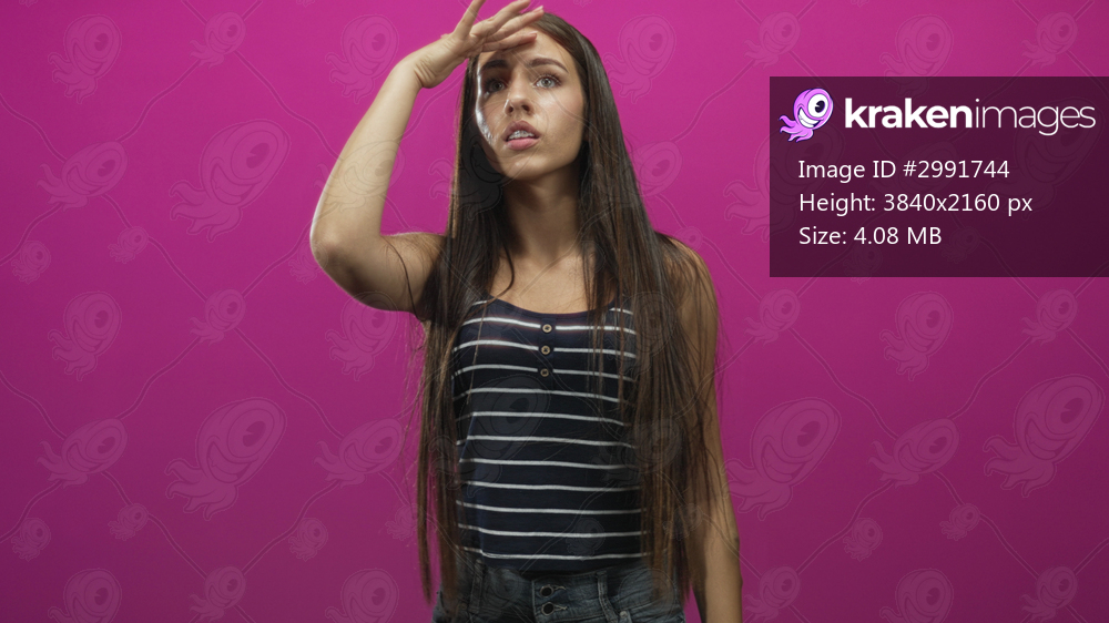 Young woman shielding eyes with hand in pink studio, long hair and striped tank top over jeans; curiosity invitation.
