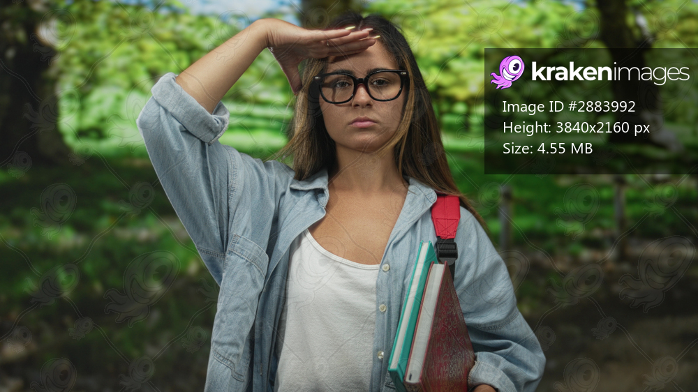 Young woman shields eyes with hand while holding books and backpack strap in forest; determination focus.