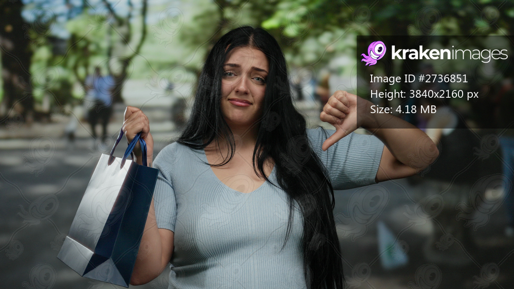 Young woman with shopping bag showing thumbs up and down in a sunny park setting highlighting her curvy plus size style and contentment while enjoying the outdoor environment. - Kraken Images