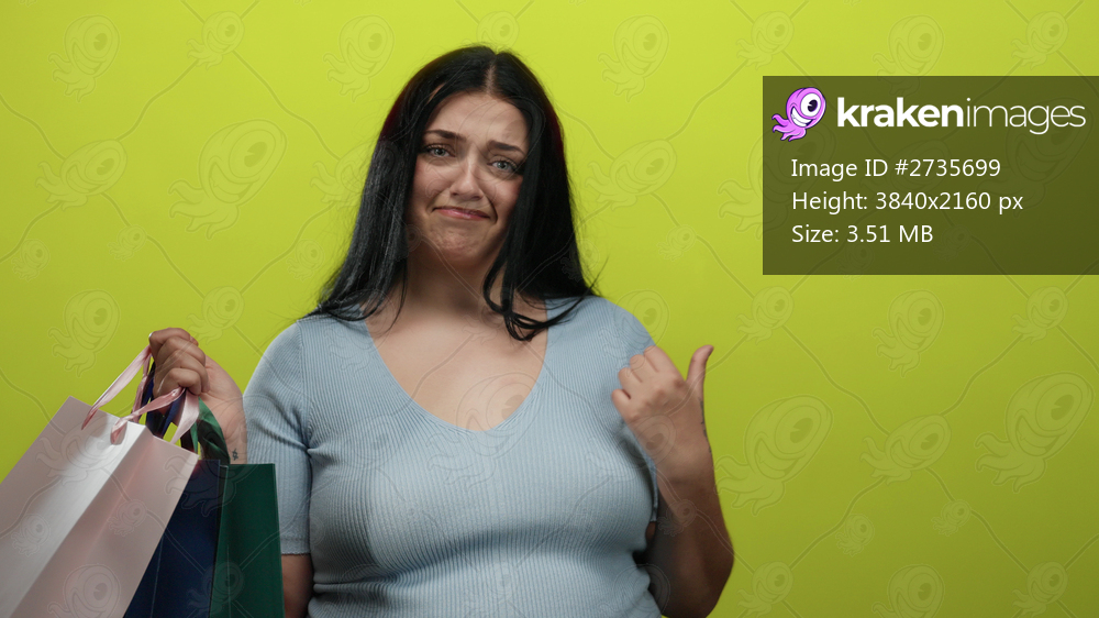Young woman with shopping bags pointing to the side over a yellow background, expressing contentment and showcasing plus size fashion with a confident pose. - Kraken Images