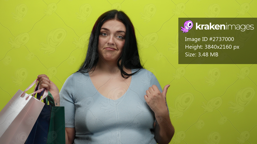 Young woman with shopping bags pointing to the side over a yellow background, expressing contentment and showcasing plus size fashion with a confident pose. - Kraken Images