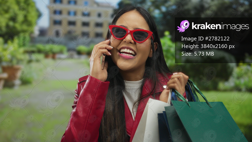 Young woman with shopping bags and sunglasses talking on phone in a sunny park setting, surrounded by green trees and a stylish urban backdrop.