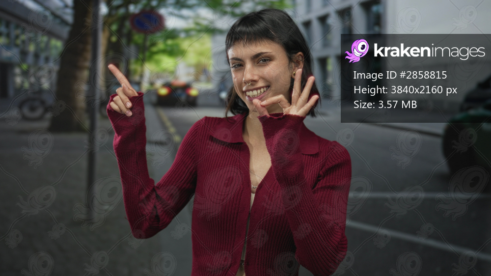 Young woman with short dark hair smiling in red sweater makes ok sign and points finger to parked car on city street; joy.