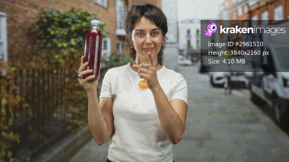 Young woman with short hair holding a clear bottle of dark red pomegranate juice, index finger to lips hush gesture on a street near parked vans; playful secrecy. - Kraken Images