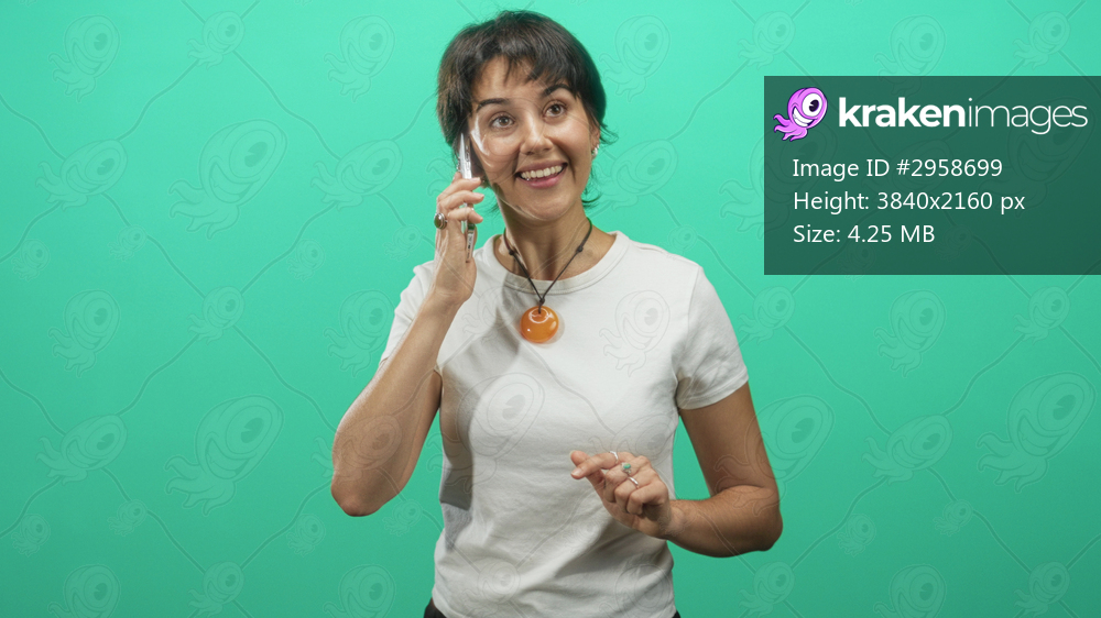 Young woman with short hair holding smartphone to ear, hand on hip, wearing white t shirt and orange pendant in studio; amused conversation curiosity.