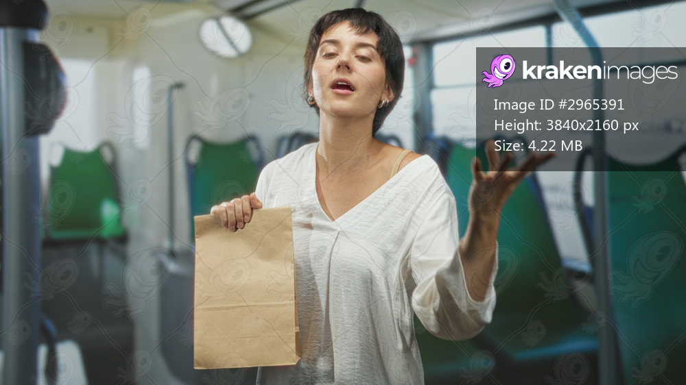 Young woman with short hair holds and presents a paper bag, gestures with hand, and shows open mouth in studio; playful curiosity.