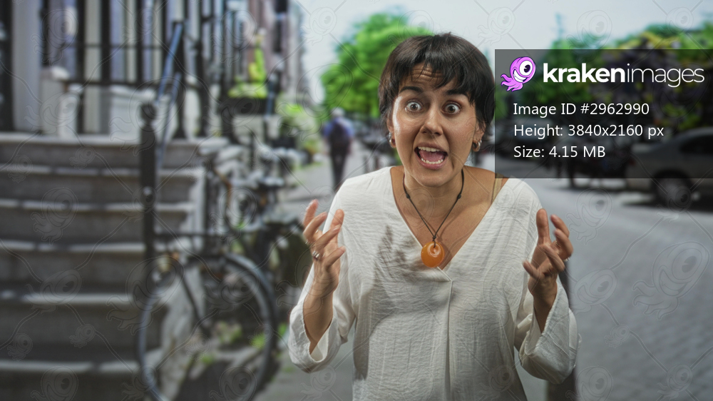 Young woman short hair, open mouth and hands spread, wearing orange pendant necklace, gesturing angrily on a city street by bicycles and parked cars; frustration urgency. - Kraken Images