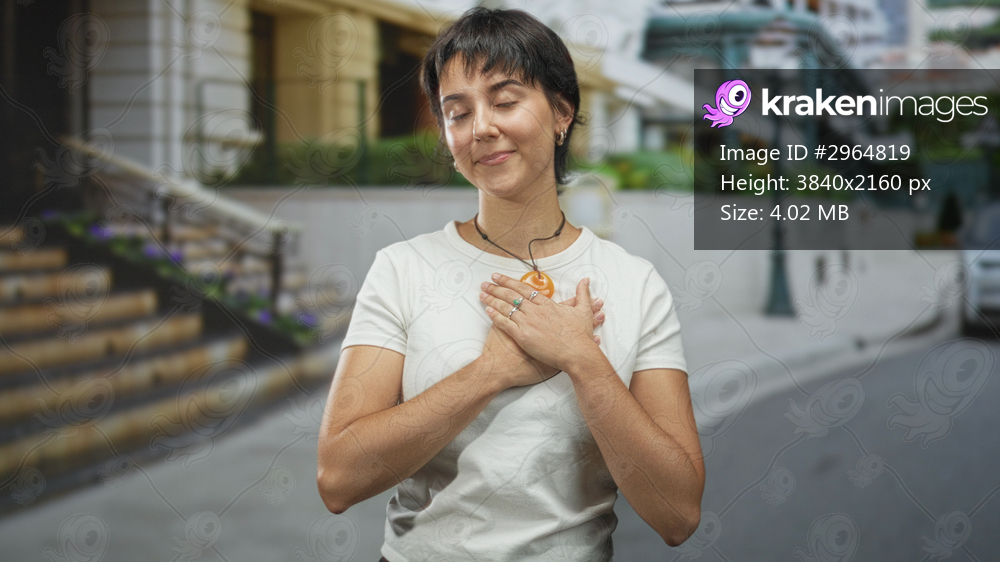 Young woman short hair presses hands to chest holding pendant on a city street; gratitude warmth sincerity.