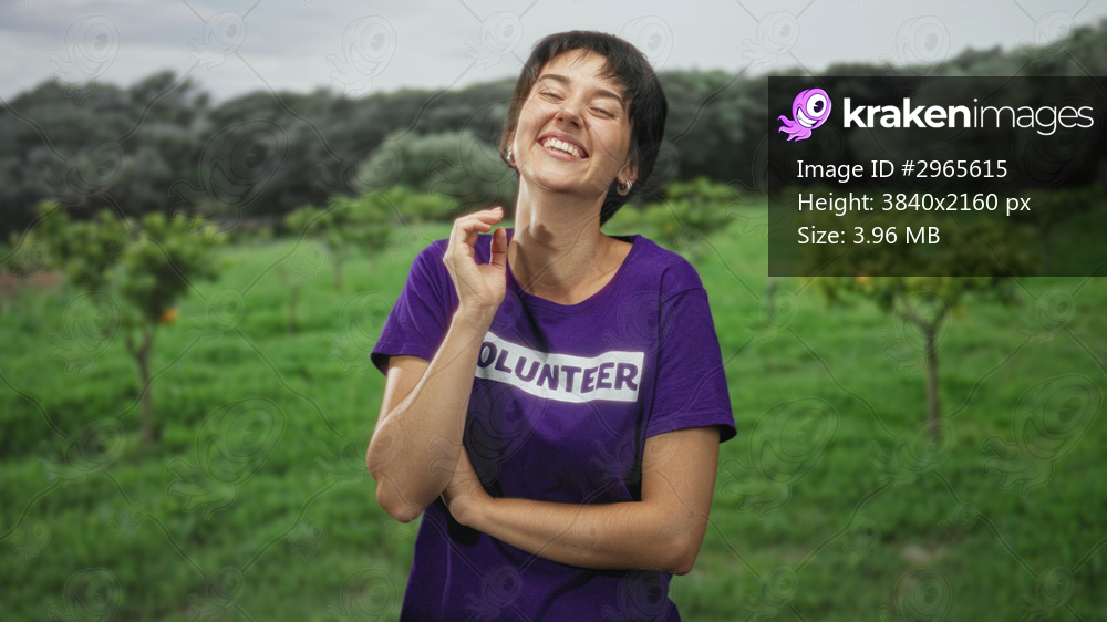 Young woman with short hair wearing a volunteer tshirt, hand to neck smiling in a forest; community service joy.