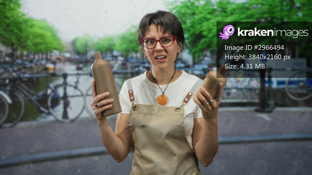 Young woman with short hair wearing apron and red glasses holds two pottery bottles in her hands on a street by a canal with parked bicycles; confusion. - Kraken Images