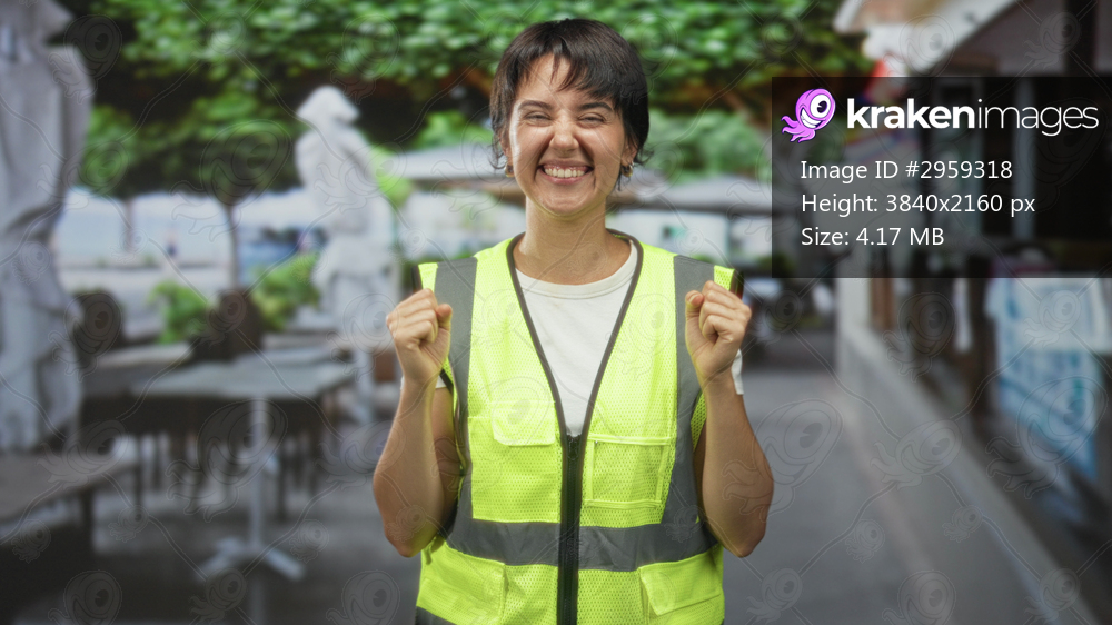 Young woman with short hair wearing yellow safety vest, raising fists and smiling on a busy street near outdoor cafe; celebration victory.