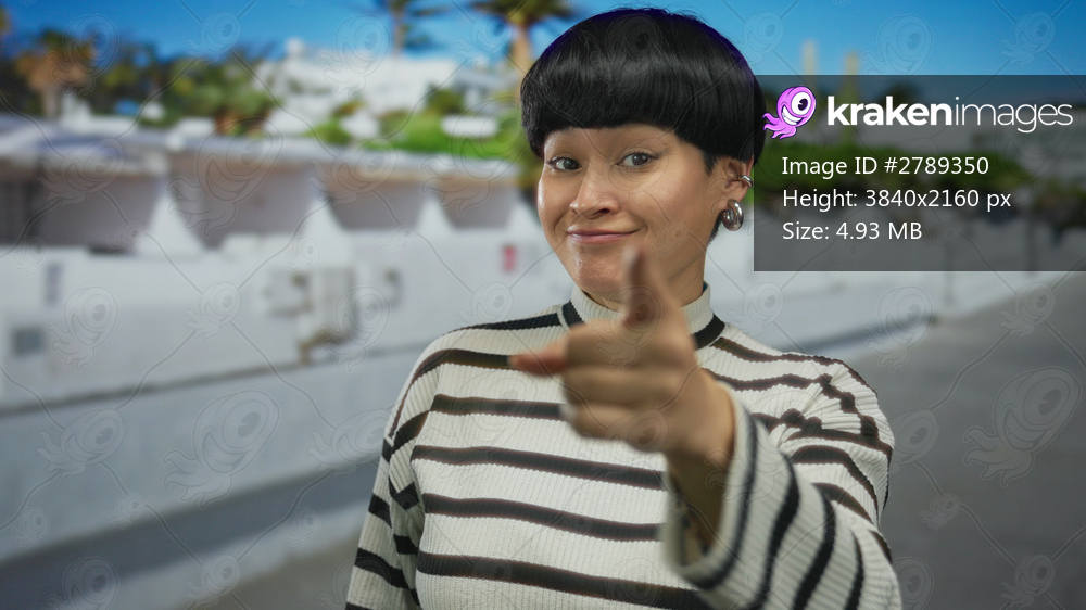 Young woman with short hairstyle pointing finger playfully outdoors against vibrant urban backdrop wearing striped sweater and earrings.