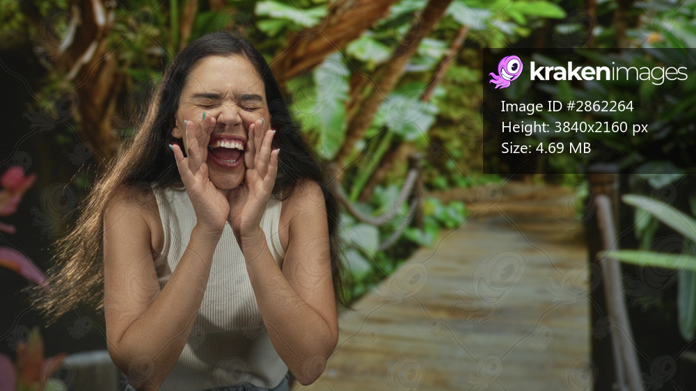 Young woman shouting with hands cupped at mouth on a sunlit wooden boardwalk in forest park surrounded by green foliage and plants; joy.