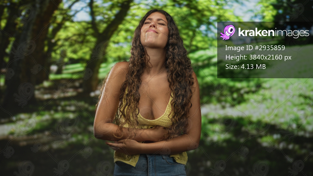 Young woman showing cleavage clutching her stomach and grimacing in a forest setting; pain nausea unwell.