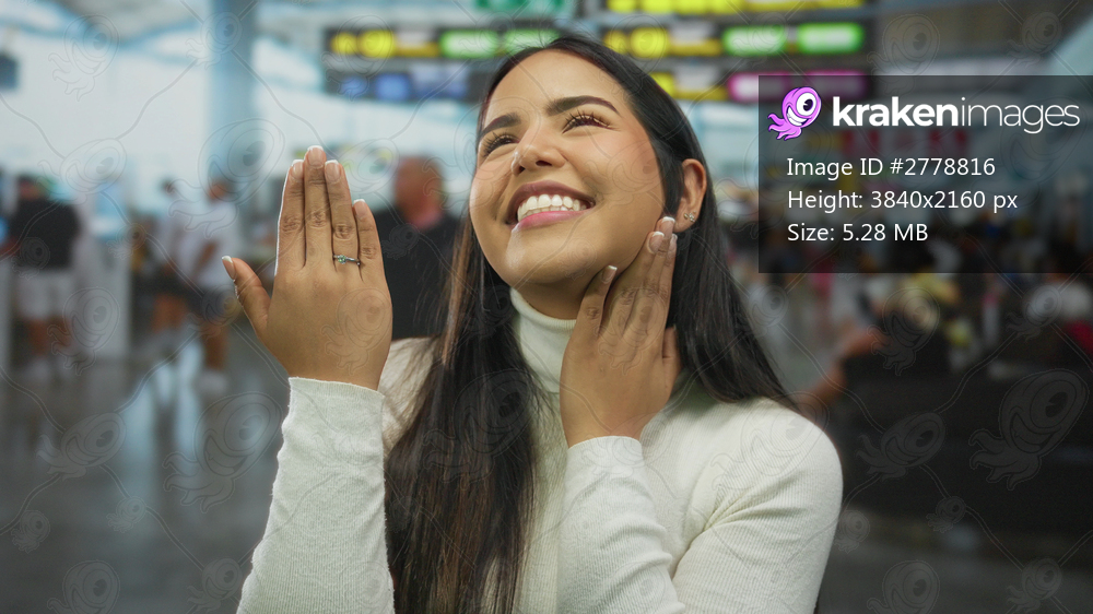 Young woman showing engagement ring joyfully in bustling airport terminal, with bright signs and people in background conveying a vibrant travel atmosphere. - Kraken Images