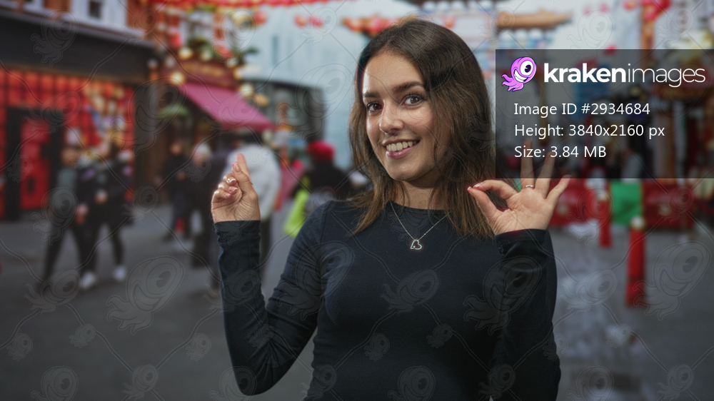 Young woman showing ok sign with both hands while pointing with index finger in a busy street market; approval joy.