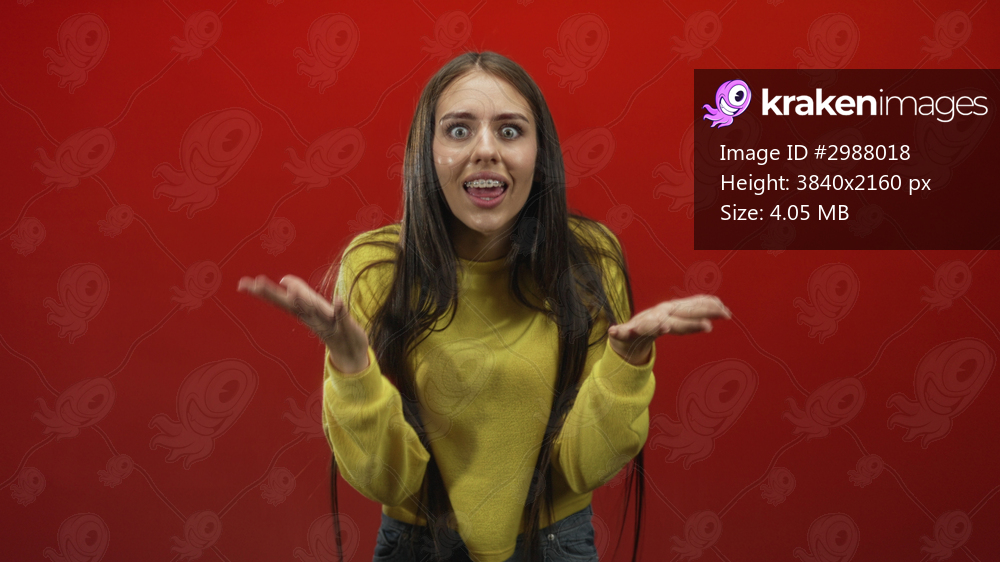 Young woman showing open hands in a questioning shrug gesture in a red studio with long hair and yellow sweater; confusion.