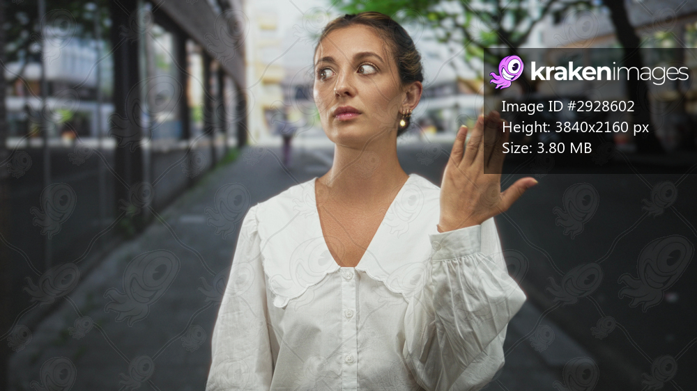 Young woman showing palm up gesture on a city street while wearing a white blouse and looking away; indifference.