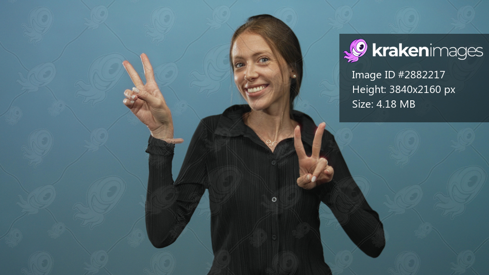 Young woman showing peace sign with both hands and smiling in blue studio while wearing a black shirt; joy playfulness.