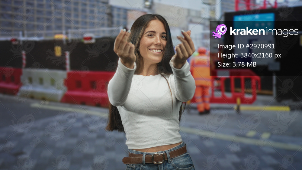 Young woman showing pinched fingers gesture with hands on a busy city street construction site; playful invitation.