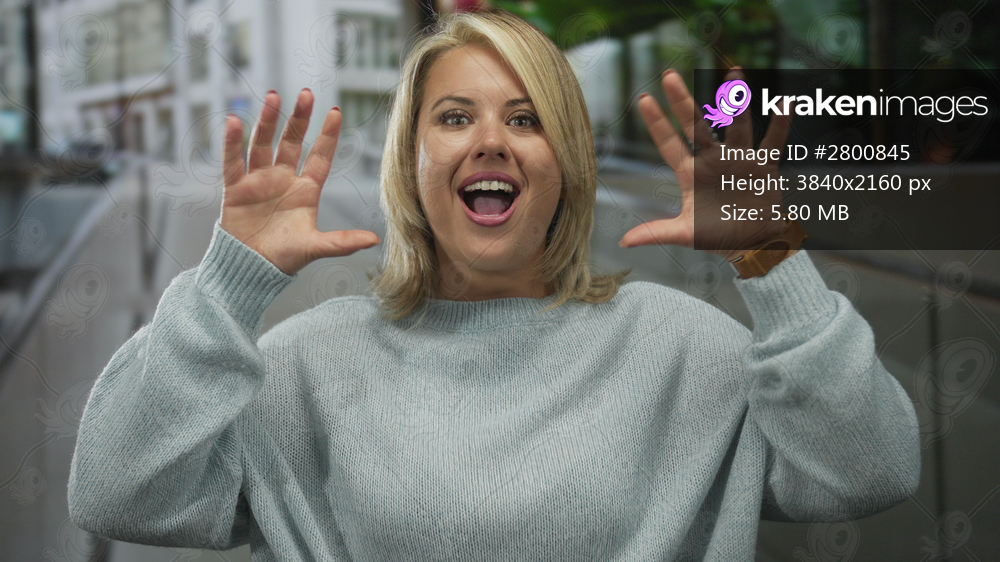 Young woman showing teeth and clawing hands in roaring gesture with mouth open widely on busy street; playfulness.