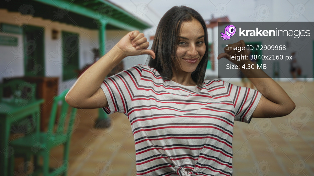 Young woman showing thumbs to chest and smiling in street with green chairs and white building facade; playful confidence.
