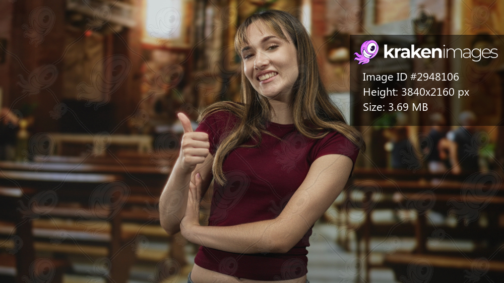 Young woman showing thumbs up gesture in church interior with wooden pews and warm lighting; joy faith approval.