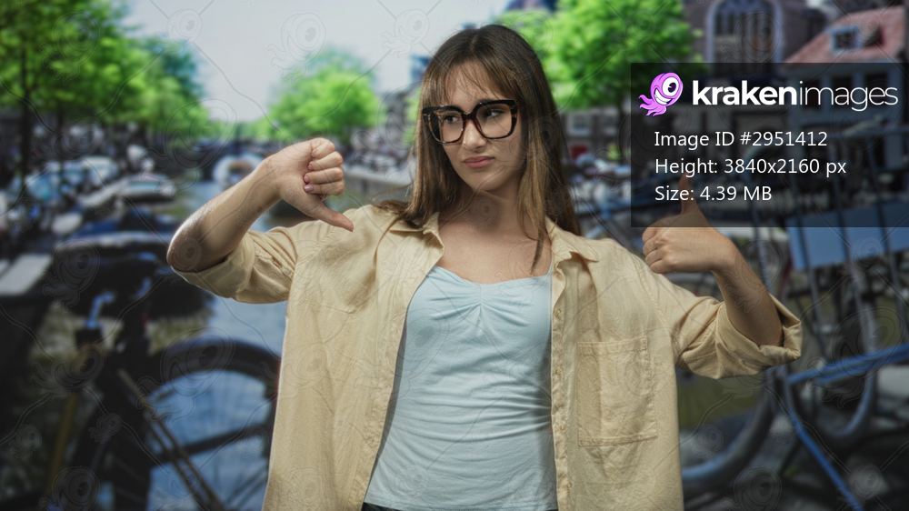 Young woman showing thumbs up and thumbs down on amsterdam street with canal and bicycles in view; ambivalence.