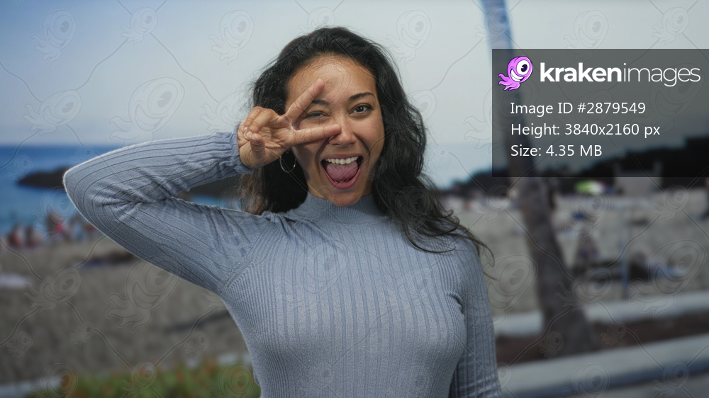 Young woman showing two finger peace sign with hand at eye level on a beach street promenade near the ocean; joy.
