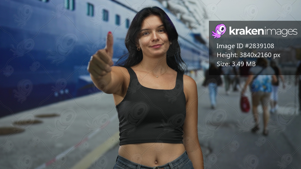 Young woman shows a raised thumb up in front of a large docked boat on a street by the water at a port; approval.