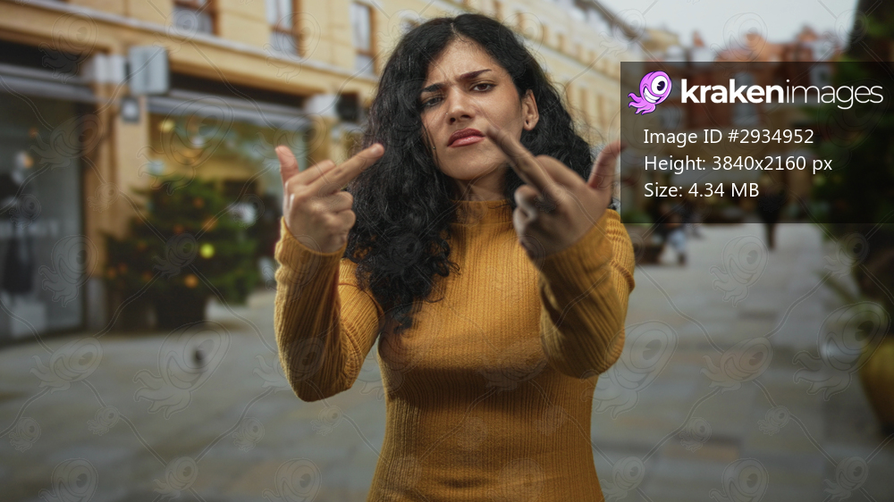 Young woman shows both middle fingers to camera on a city street lined with shops and pedestrians; defiance.