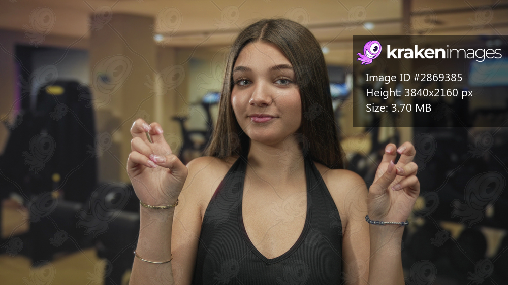 Young woman shows clear airquotes with both hands in spacious brightly lit gymnasium area; sarcasm.