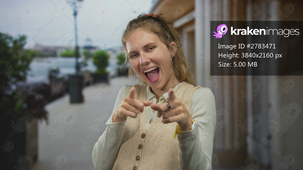 Young woman shows fingers while pointing on a street as blonde hair catches light with a bright smile and laughing face towards the camera near a building front in an urban scene. - Kraken Images