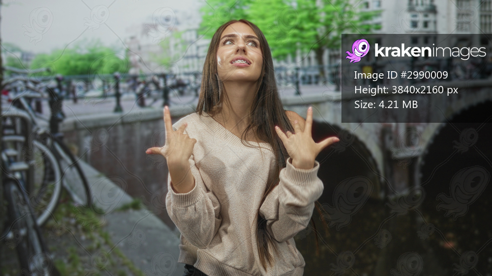 Young woman shows palms and shrugs with pursed lips on a street canal bridge near bicycles; annoyance defiance.