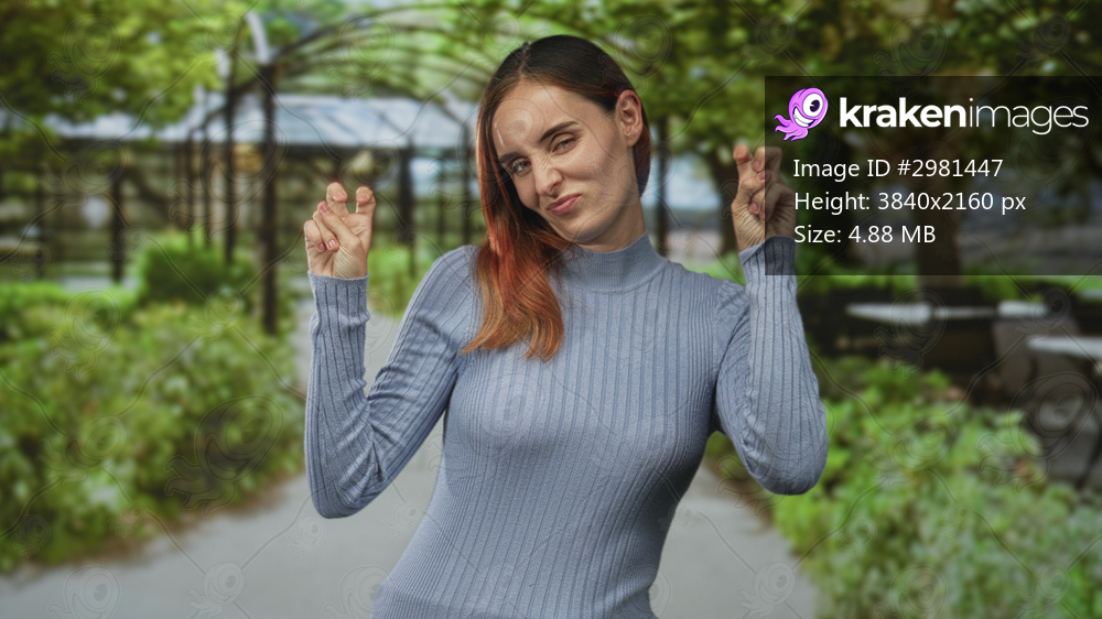 Young woman shows peace sign with both hands on a street, smiling and wearing a ribbed turtleneck sweater with freckles visible; playful confidence.