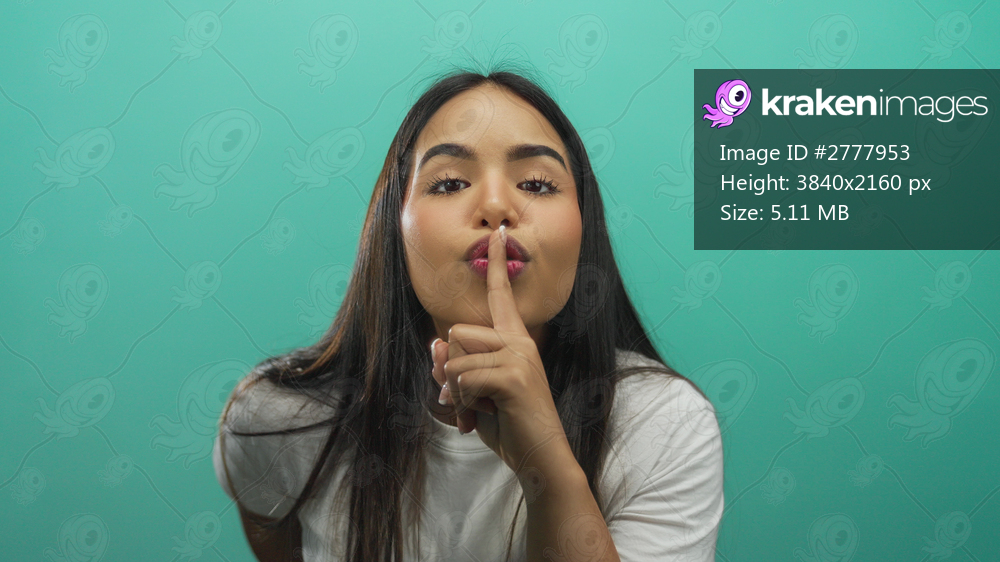 Young woman signaling silence with finger on lips against green wall, expressing secrecy, calmness, and mystery with long hair and white shirt.