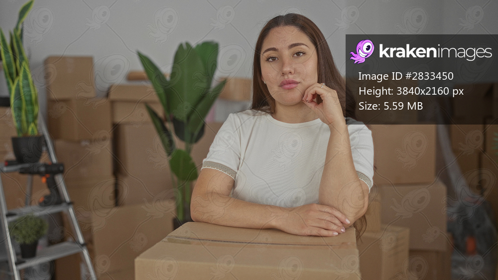 Young woman sits on cardboard box with hand on chin among moving boxes in home; quiet contemplation.