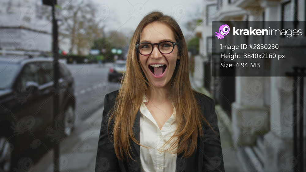 Young woman smiles broadly with open mouth beside parked cars on city street; joy optimism confidence.