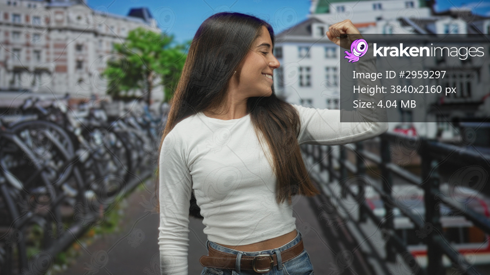 Young woman smiles and flexes fist showing bicep and forearm on street by parked bicycles and canal bridge; confidence empowerment.